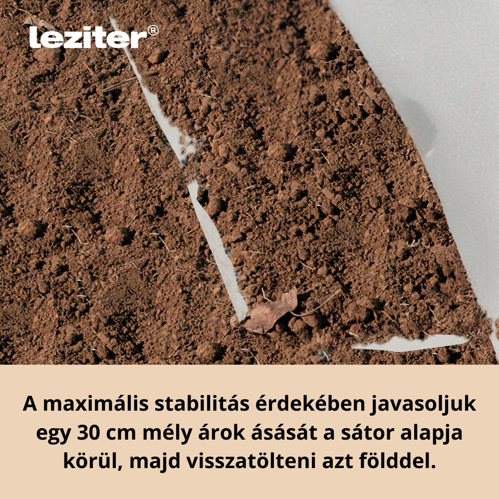 - Rögzítés: a fólia körbefutó „szoknyarésszel” leterhelhető vagy földbe ásható