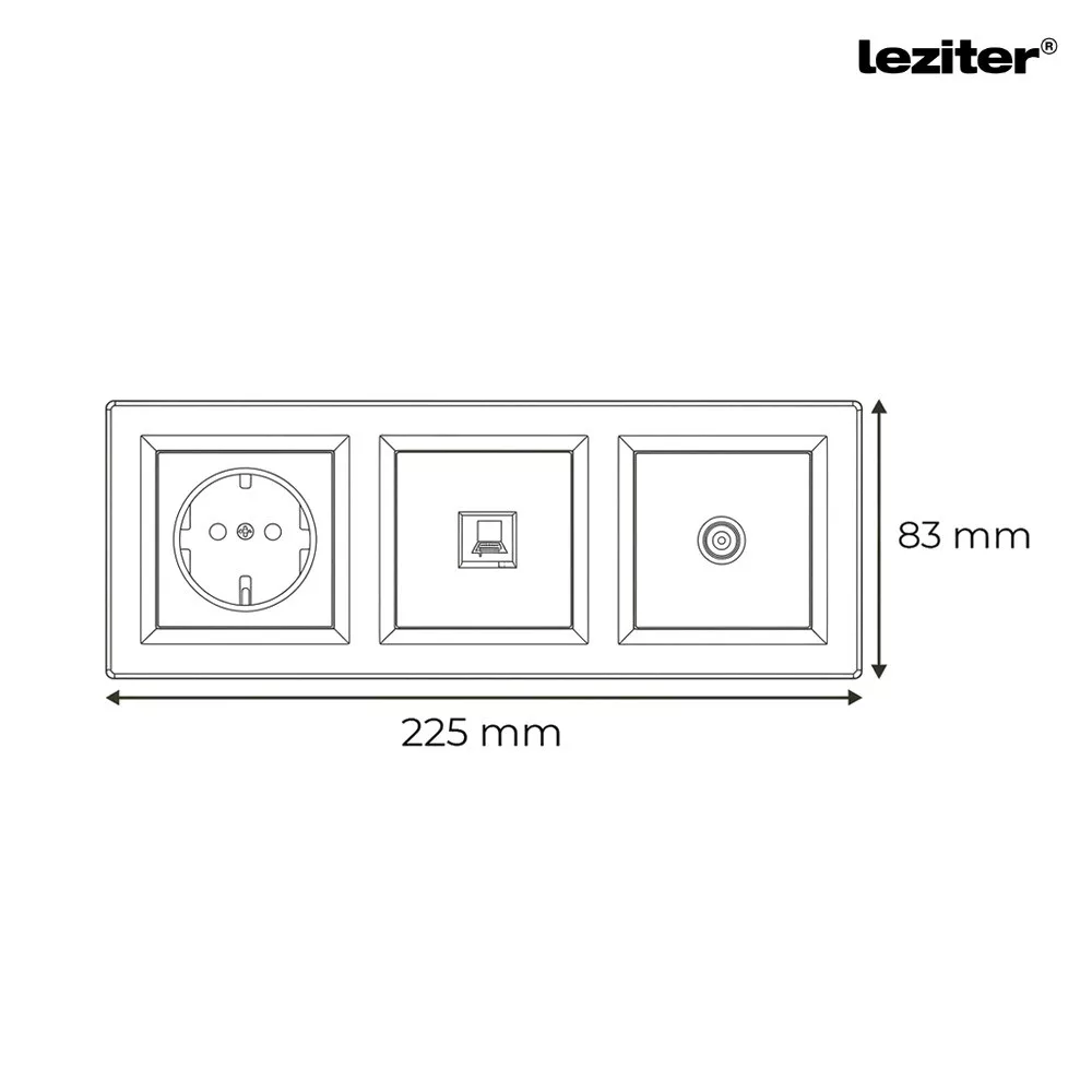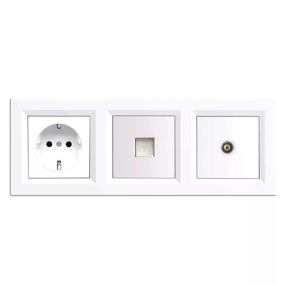 Ez a Nova szerelvényszett ideális megoldás azoknak, akiknek fontos a funkcionalitás, az esztétikum és az egységes megjelenés. A hármas kialakítás egy földelt 230 V-os csatlakozóaljzatot, egy RJ-45-ös UTP aljzatot és egy koaxiális TV csatlakozót foglal magába – mindezt egyetlen, letisztult fehér keretbe rendezve. A vízszintes modulelrendezés praktikus és jól átlátható.