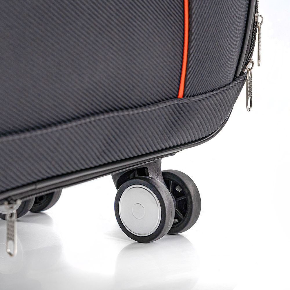 A négy dupla kerék halk és gördülékeny mozgást biztosít mindkét bőrönd esetében, bármely irányban. A kabinbőrönd levehető kerekei lehetővé teszik, hogy az a legtöbb légitársaság kézipoggyász-méret előírásainak is megfeleljen – ideális választás repülős utakhoz.