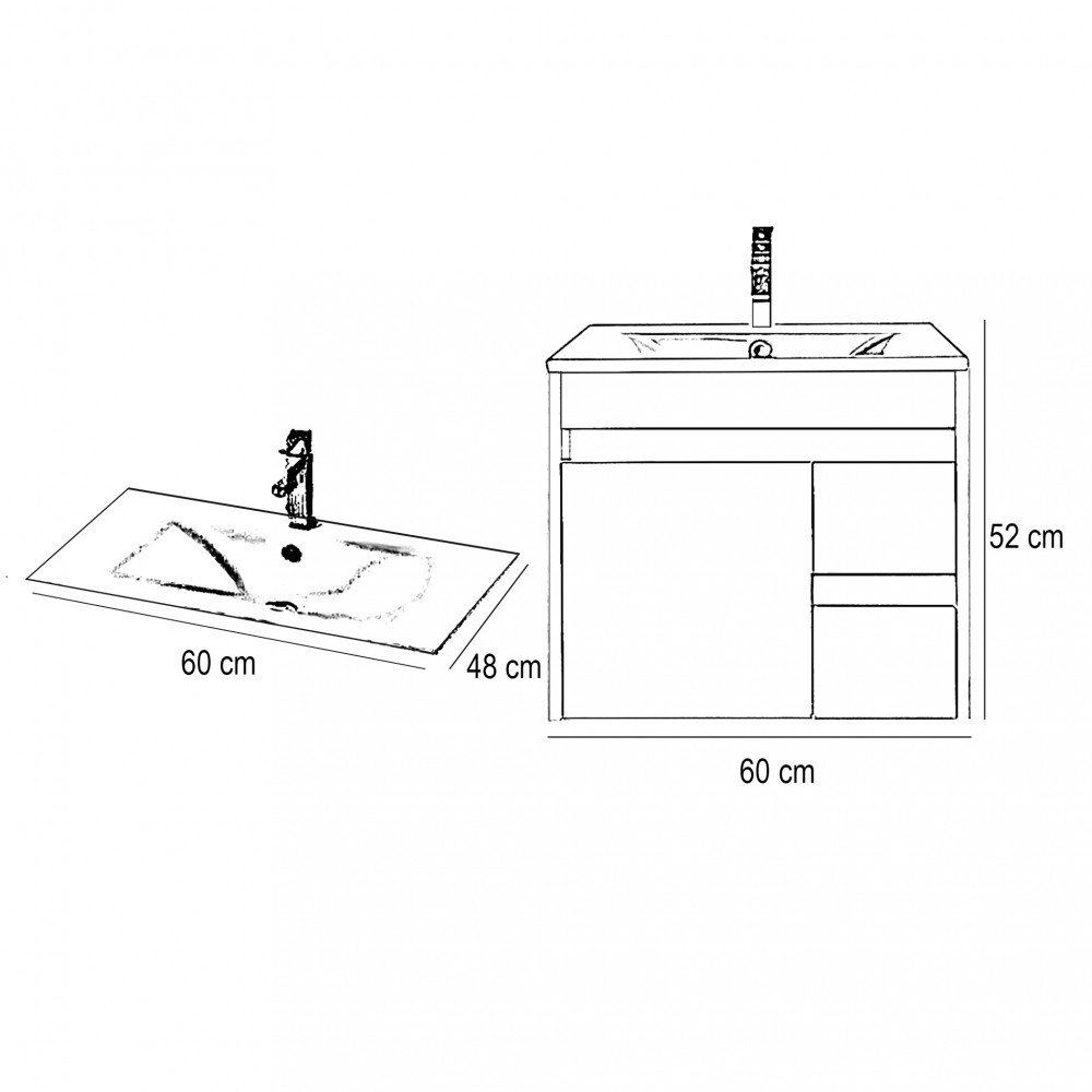 A fürdőszoba bútor tágas fiókokkal rendelkezik ahol kényelmesen elférnek a fürdőszobai pipere eszközök. Kompakt kialakítása miatt kisebb fürdőszobák berendezésére is alkalmas, például panel lakásokban. A termék magas minőségű bútorlapból készül és színben passzoló élzárókkal van ellátva. A fürdőszoba bútor felfüggesztett kivitelben kapható.