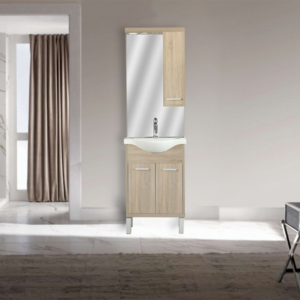 A fürdőszobabútor kevés helyet foglal viszont tágas szekrénnyel rendelkezik, ahol kényelmesen elférnek a fürdőszobai pipere eszközök. Kevés helyigénye miatt kisebb fürdőszobák berendezésére is alkalmas, például panel lakásokban. A termék magas minőségű bútorlapból készül és színben passzoló élzárókkal van ellátva. A fürdőszobabútor mosdóval együtt kapható.