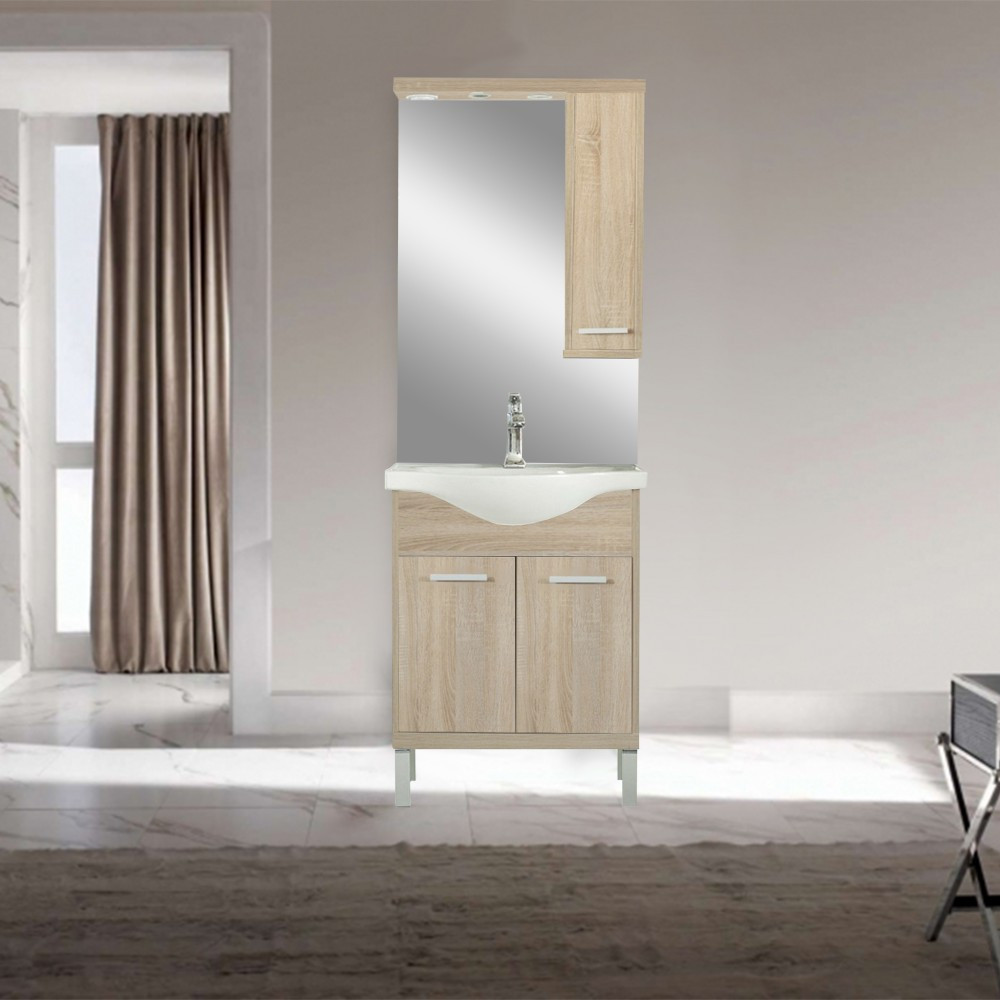 A fürdőszoba bútor kevés helyet foglal viszont tágas szekrénnyel rendelkezik ahol kényelmesen elférnek a fürdőszobai pipere eszközök. Kevés helyigénye miatt kisebb fürdőszobák berendezésére is alkalmas, például panel lakásokban. A termék magas minőségű bútorlapból készül és színben passzoló élzárókkal van ellátva. A fürdőszoba bútor mosdóval együtt kapható.