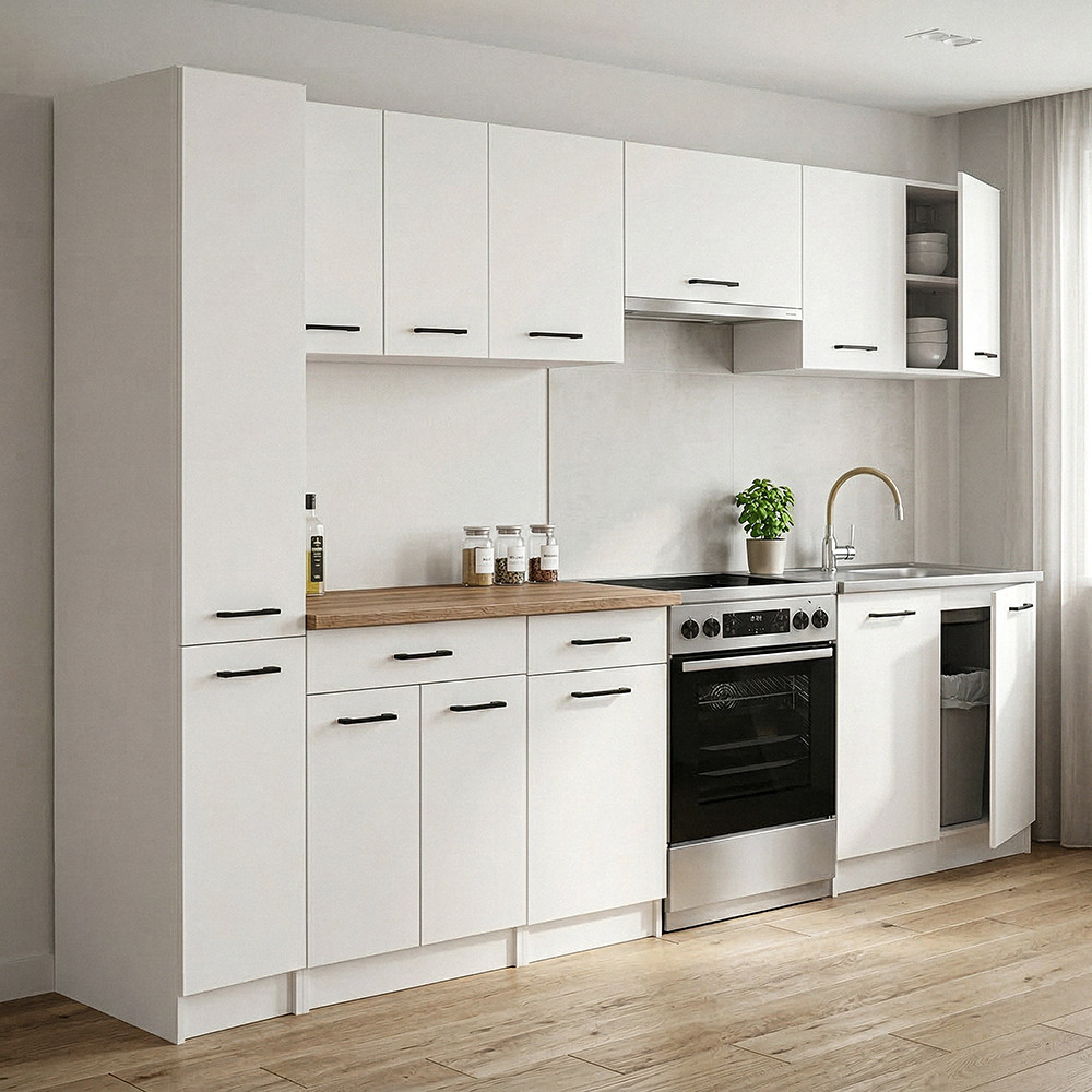 A Praktik konyhabútor fehér korpusszal és fehér fronttal időtálló, letisztult megjelenést kínál, amely könnyedén illeszkedik bármilyen lakberendezési stílushoz. Világos színvilága optikailag tágítja a teret, így ideális választás különböző méretű konyhákba.