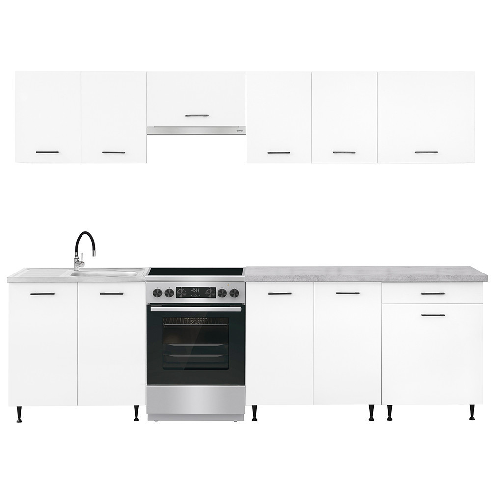 A 280 cm széles konyhabútor négy felső és három alsó szekrényből áll, amelyek praktikus tárolóhelyet kínálnak a konyhai eszközök számára. A két 80 cm-es alsó szekrény alkalmas nagyobb edények vagy konyhai kellékek elhelyezésére, míg a 60 cm-es fiókos–ajtós szekrény jól használható evőeszközök és kisebb tartozékok rendszerezésére.