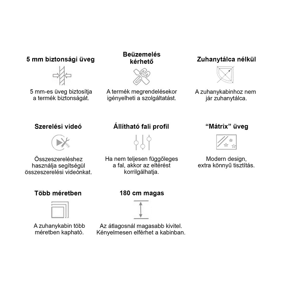 Műanyag vízzáró profilokkal rendelkezik, hogy a víz a kabinon belül maradjon. Az állítható fali profilok segítségével, ha nem teljesen függőleges a fal, akár 15 mm eltérést is korrigálhat. Amennyiben tálca nélkül rendeli, 180 cm-es magassággal, ha pedig szettben erősített akril zuhanytálcával, akkor 194 cm-es magassággal számolhat.