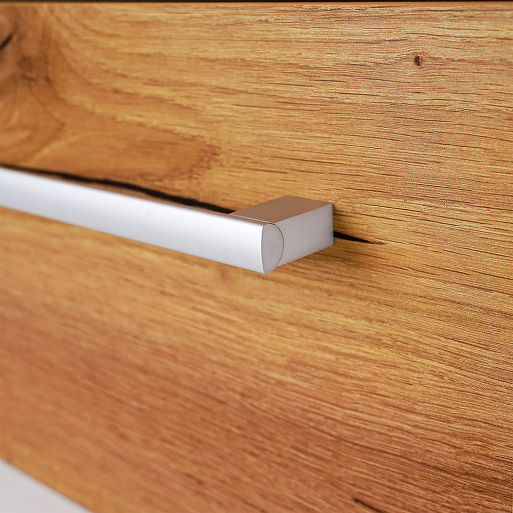 Az fehér színű korpusz és a tölgy front kombinációja elegáns és időtálló megjelenést kölcsönöz a bútornak.