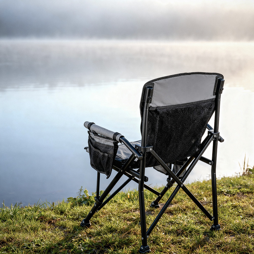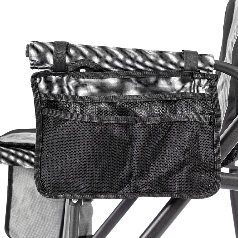 Praktikus kiegészítők – a karfába épített pohártartóban biztonságban van az italod, az oldalzsebben elfér a telefon, a dobozos csali vagy egy kis zseblámpa.