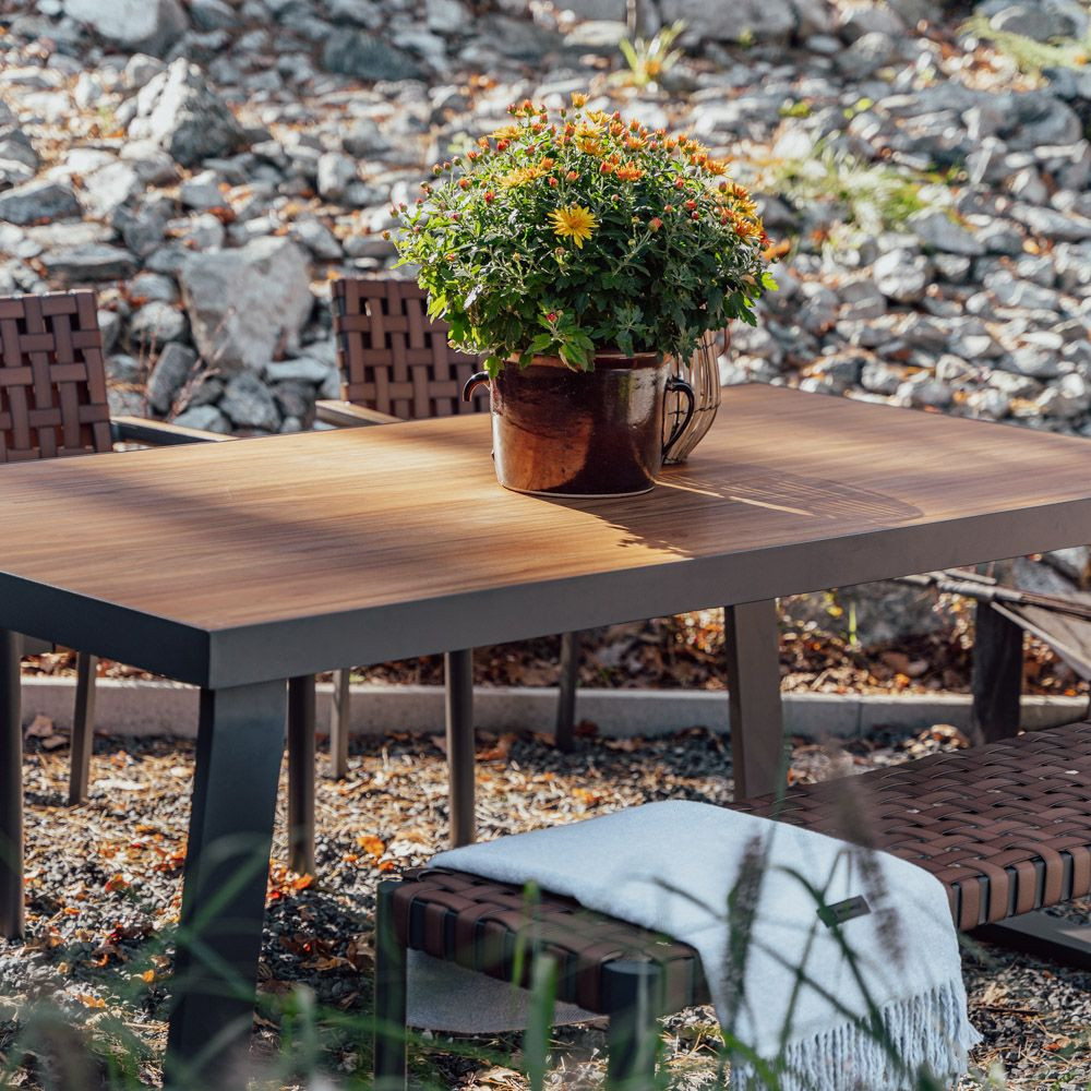 Az alumíniumból és technoratánból készült kerti bútorkészlet fokozottan ellenáll a változó időjárási viszonyoknak , így sokkal hosszabb ideig használható. A meleg színű rattan és az antracit színű karokkal kombinálva koherens egészet alkot. A nagy asztallap fát utánzó anyagból készült, könnyen tisztán tartható. Az egész egy stabil és szilárd szerkezet. A székeket úgy tervezték, hogy garantálják a legmagasabb szintű pihenést . Az étkezőgarnitúra kiválóan alkalmas nagyobb étkezésekhez.