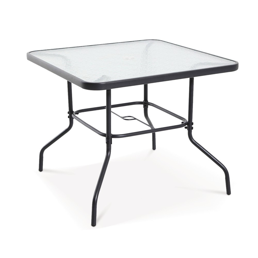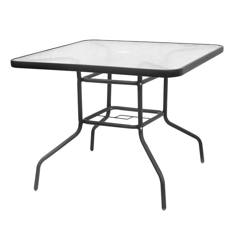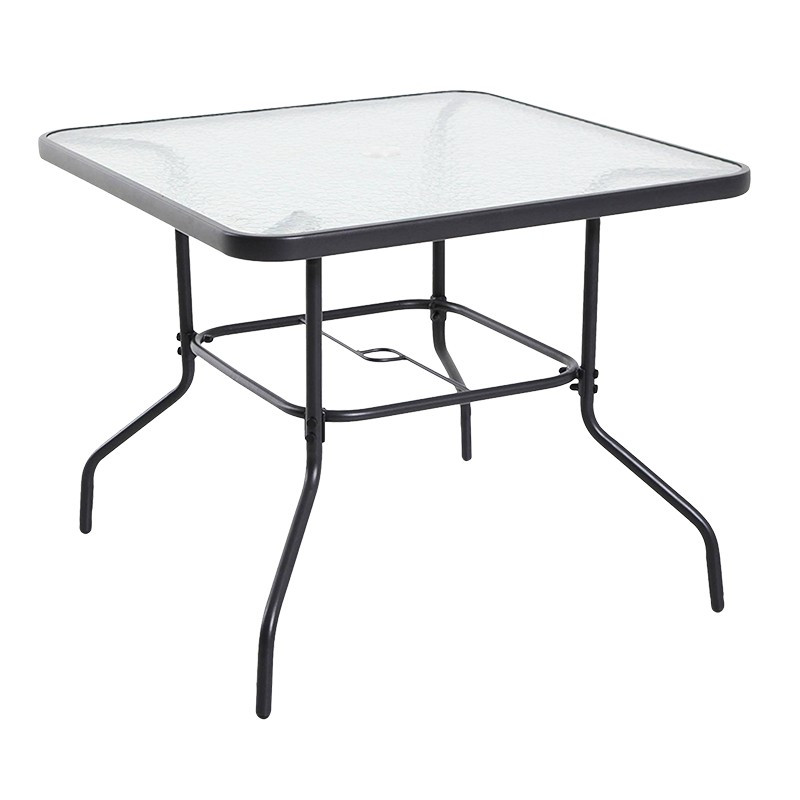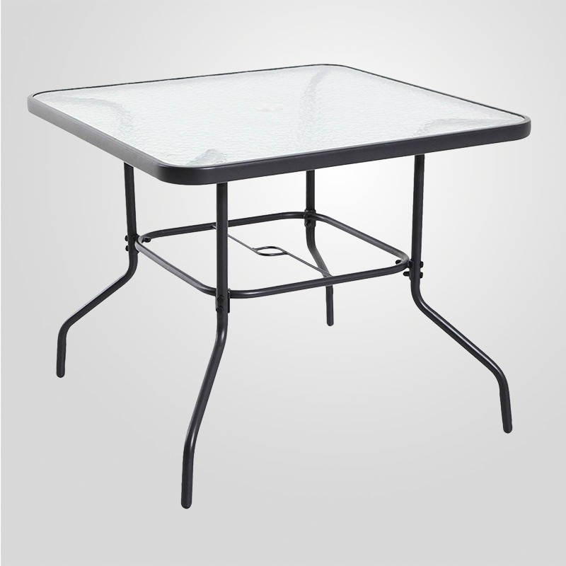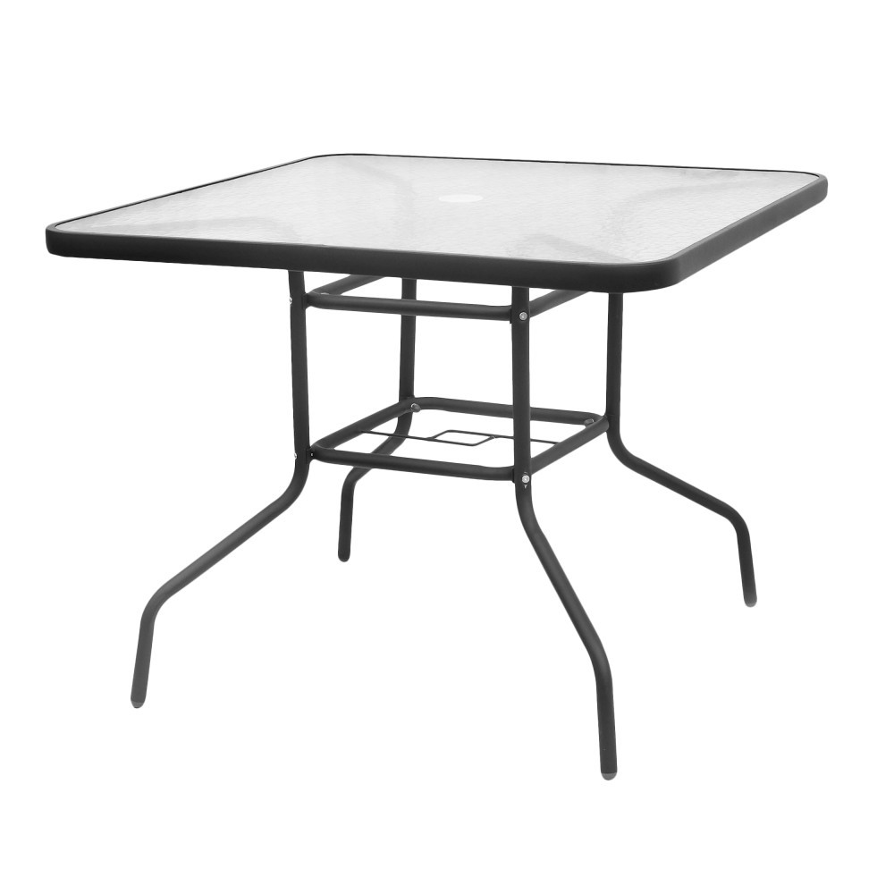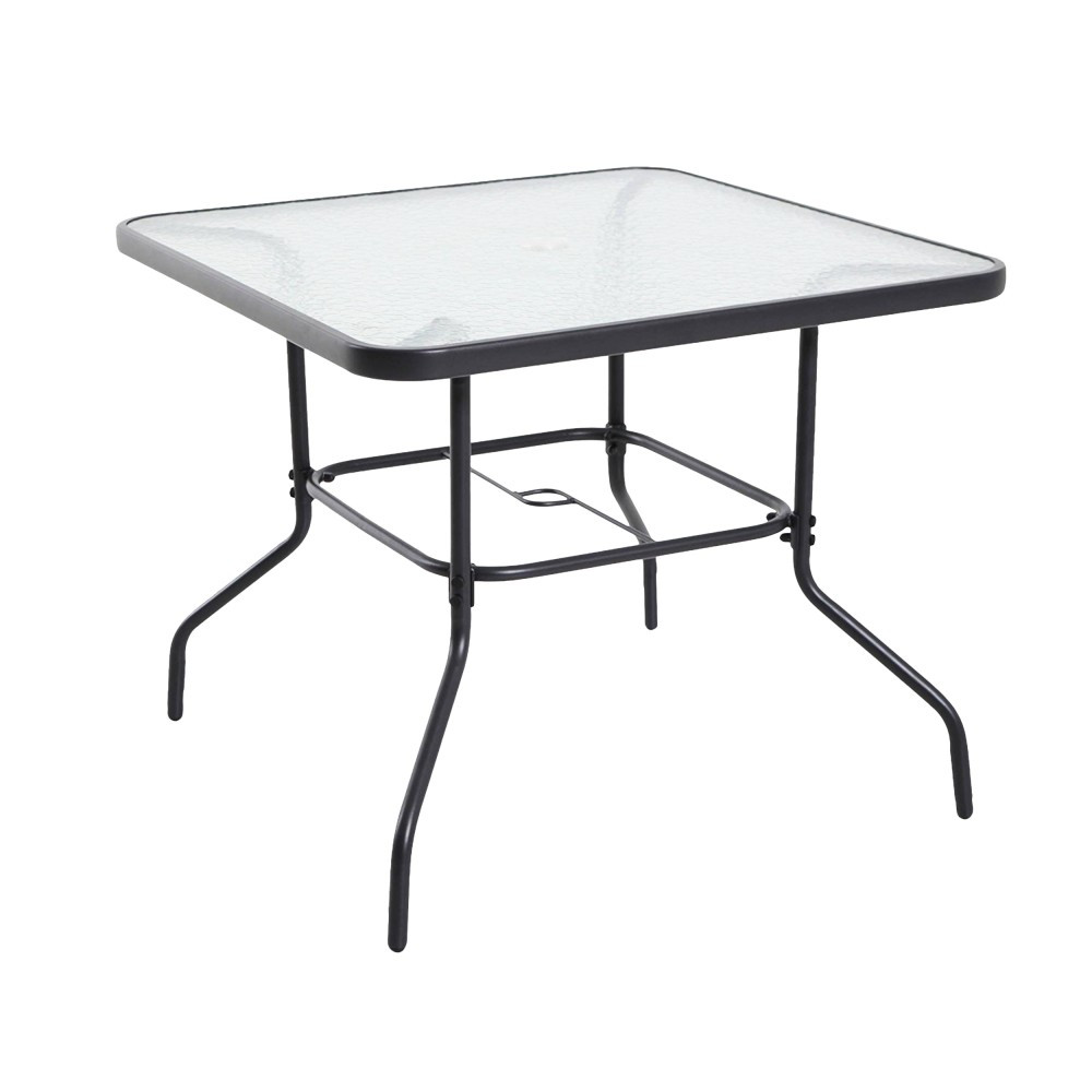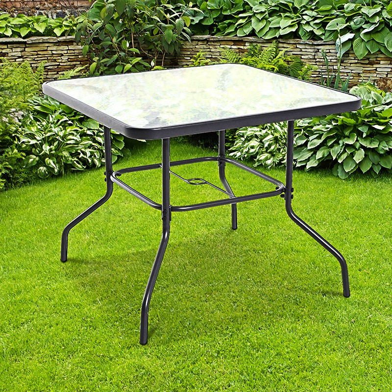 A tökéletes acél kerti asztal négyzet alakú üveg asztallappal a kerthez vagy teraszhoz.