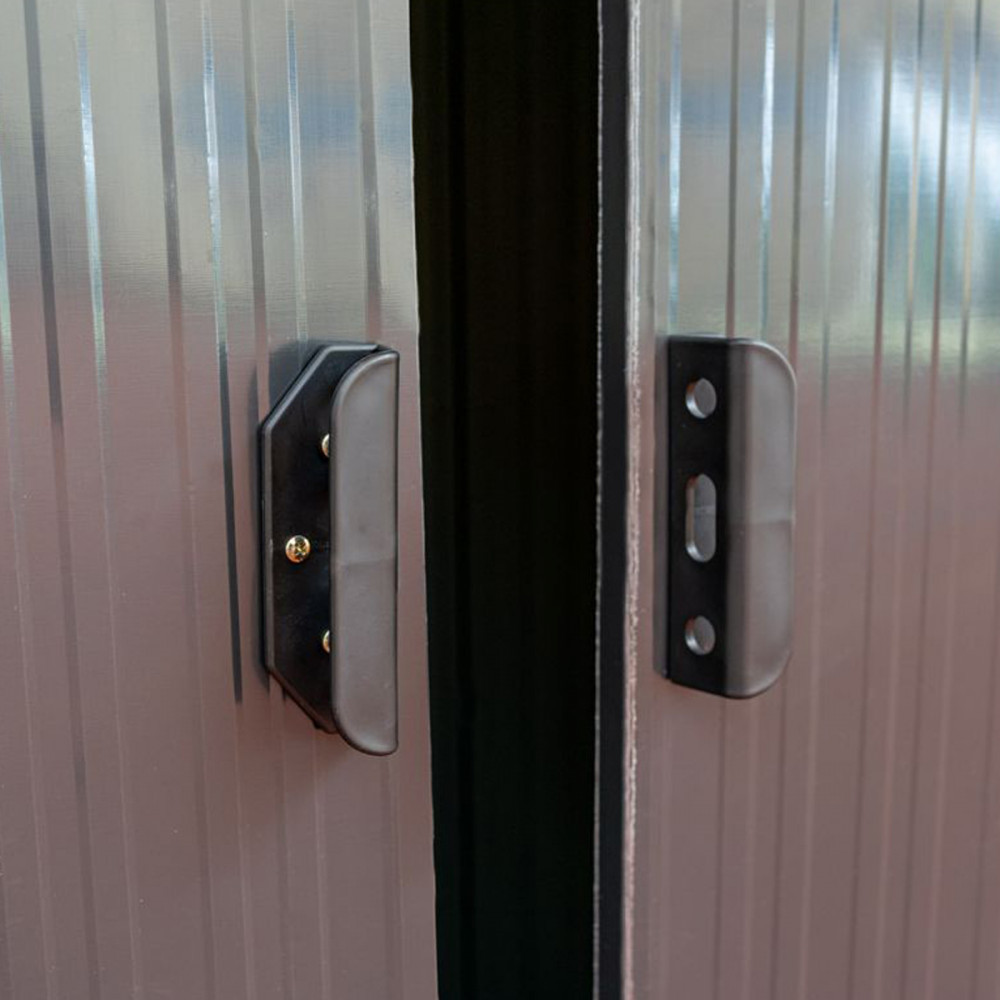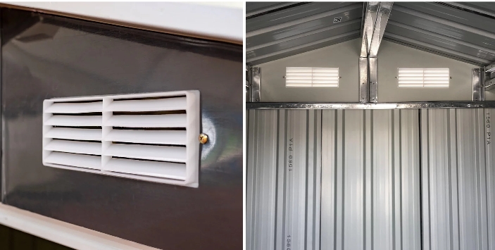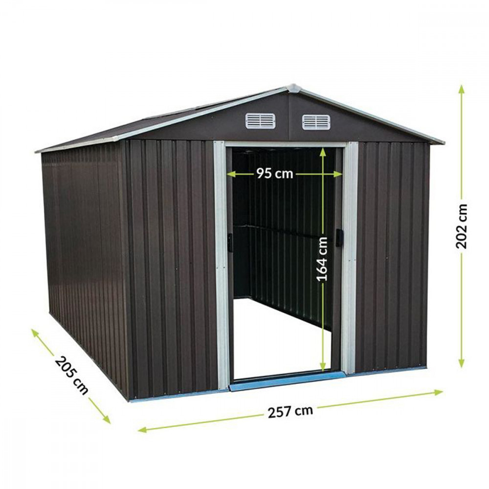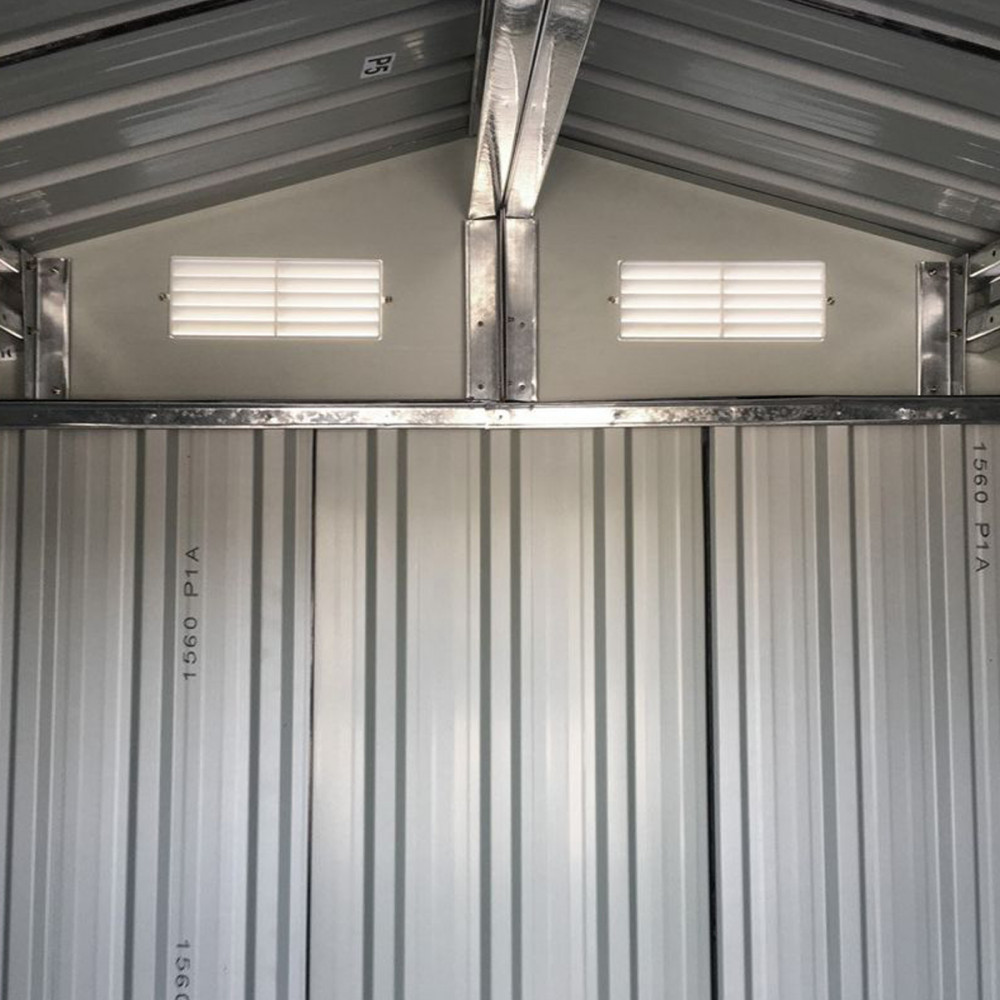 A fém szerszámház tolóajtóval rendelkezik , ennek köszönhetően nem sok helyet foglal. A kerti ház előnye az elülső fal felső részén elhelyezett szellőzőnyílások .