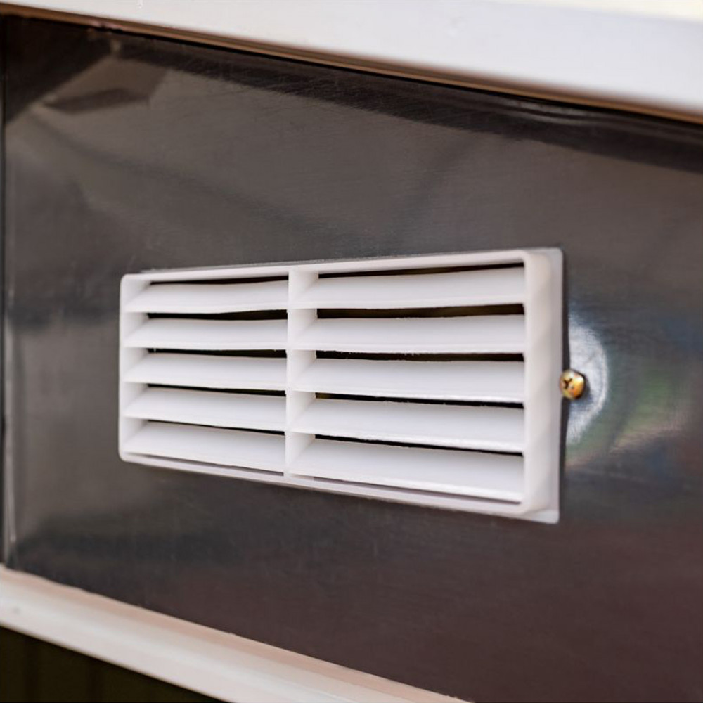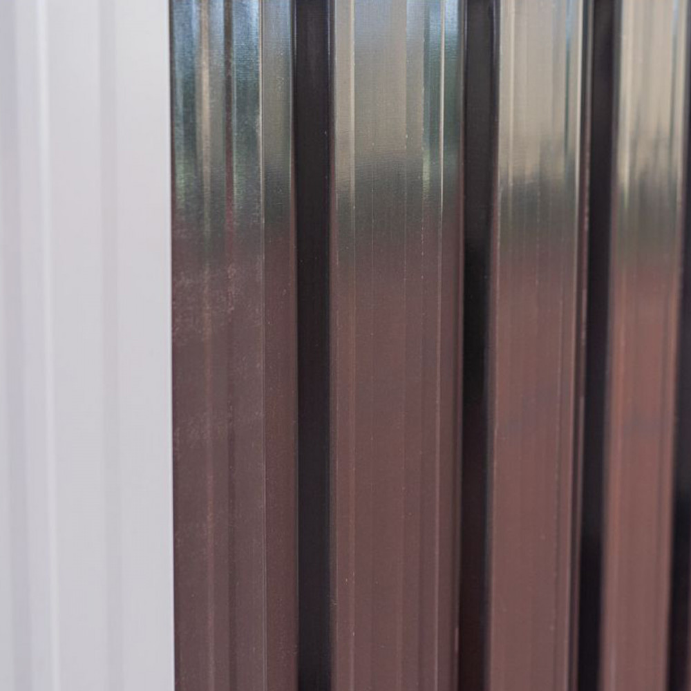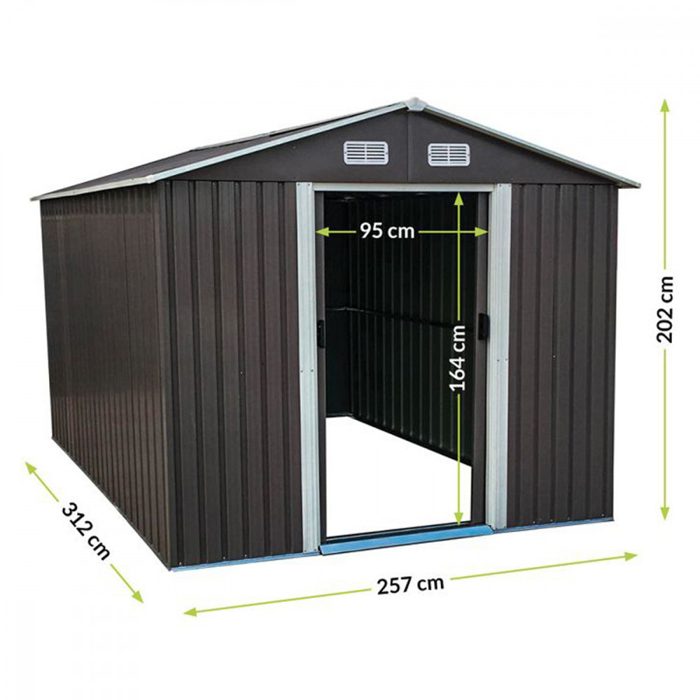 A fém szerszámház tolóajtóval rendelkezik,ennek köszönhetően nem sok helyet foglal.A kerti ház előnye az elülső fal felső részén elhelyezett szellőzőnyílások, melyek megakadályozzák a ház párásodását ezzel elkerülve a nem kívánatos penészesedést.