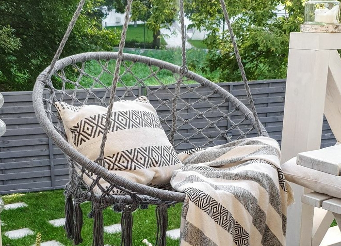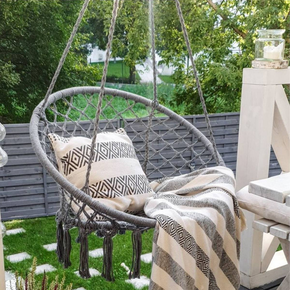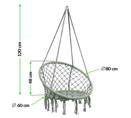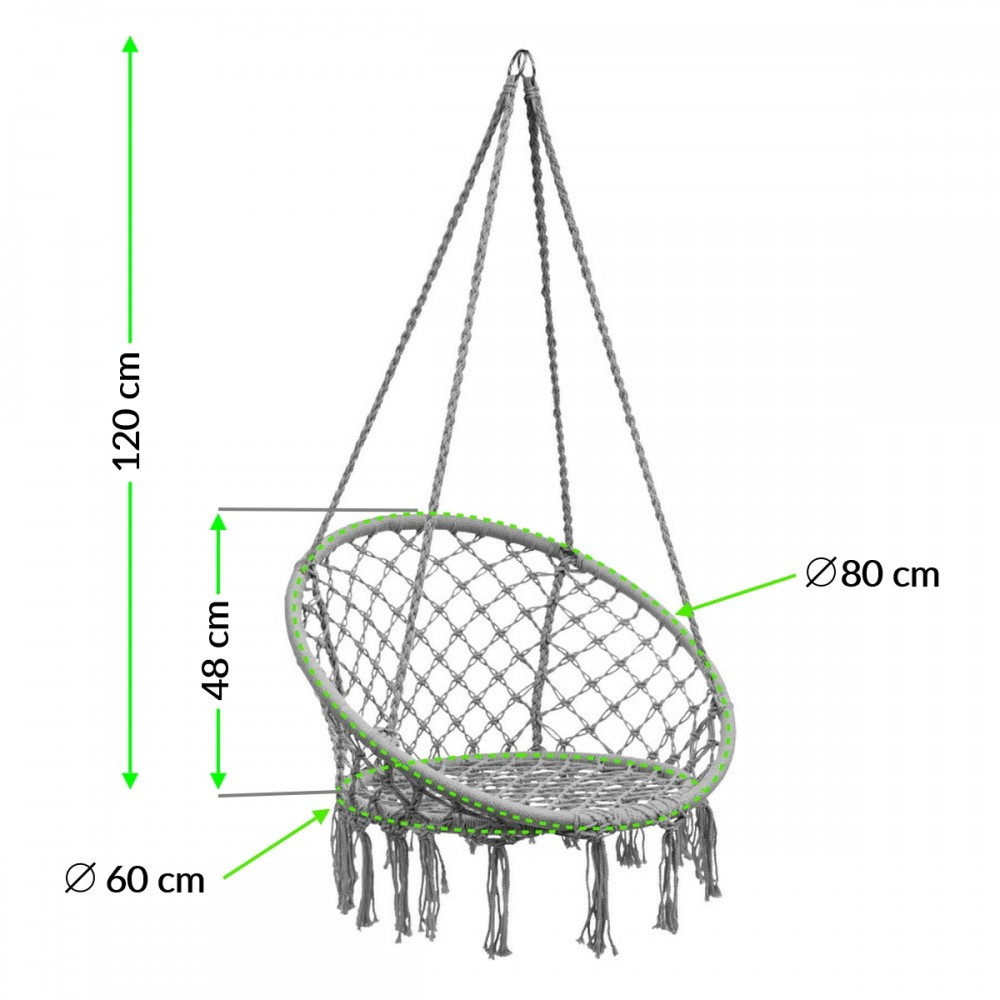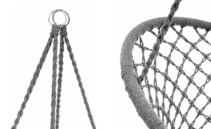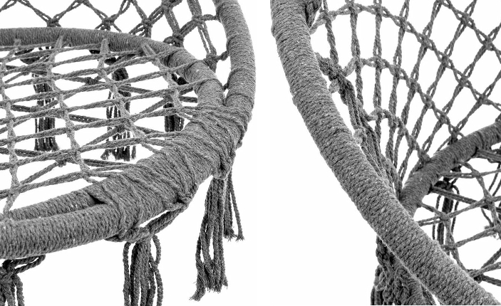 A függesztett fotel 4 erősen fonott kötéllel rendelkezik,amelyek tartóssá teszik. A felhasznált anyagoknak köszönhetően a felhasználási idő hosszabb. Nagy méretének köszönhetően egy felnőtt könnyedén használhatja a terméket. A szék külön előnye a magas háttámla, amely jelentősen növeli az ülés kényelmét.