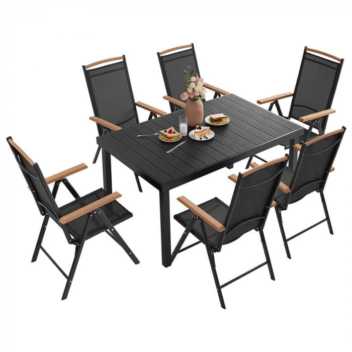 A szettben található asztal és székek egyaránt gondosan alumíniumból készültek, ami könnyű súlyt és egyszerű tisztíthatóságot biztosít. Egy további elem – a fa színű karfák – elegáns és kényelmes jelleget kölcsönöznek az egész szettnek. A kényelmes ülések és a masszív konstrukció igazi élménnyé varázsolják a szabadban töltött időt.
