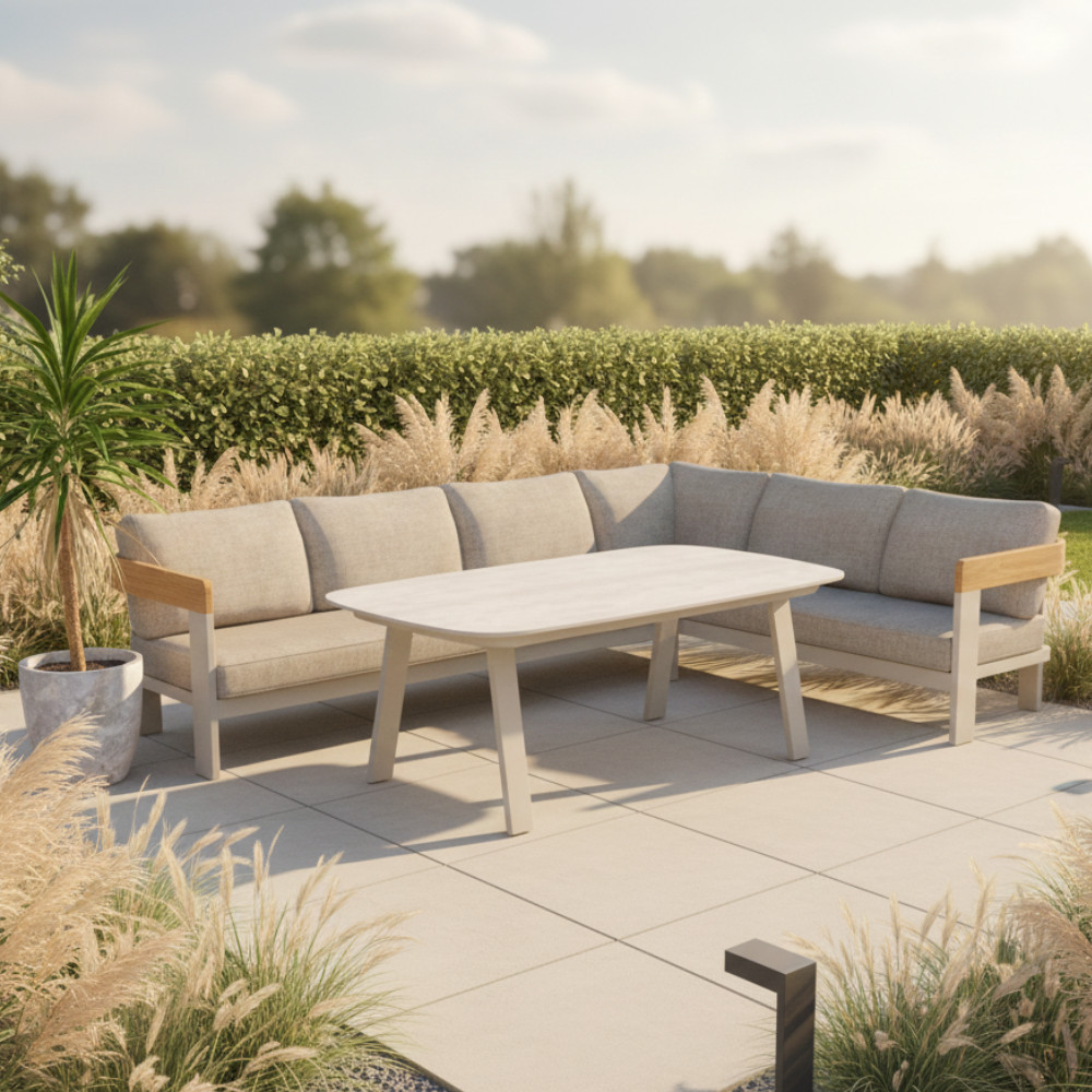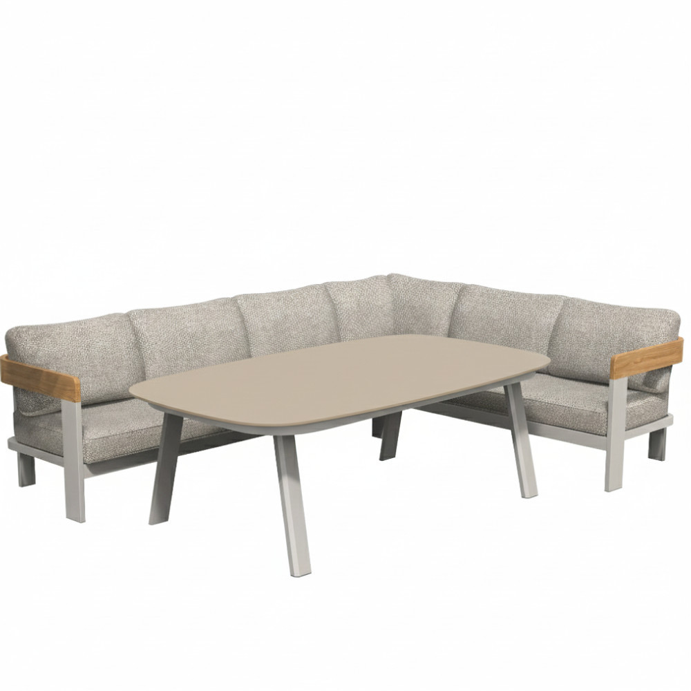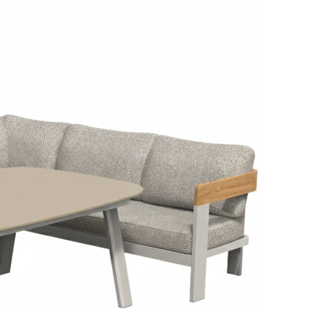 A MOLTO sarokkanapéot úgy tervezték, hogy tökéletes teret biztosítson családi étkezésekhez és délutáni pihenéshez . A masszív alumínium váz ellenáll a korróziónak és a vetemedésnek, így a bútor még sok évszak után is remekül néz ki. A kényelmes, vastag háttámlák és a tágas ülések teljes ellazulást tesznek lehetővé, akár asztali megbeszélésekre, akár egy könyvvel eltöltött csendes pihenésre használják a garnitúrát. A visszafogott színek és a modern forma tökéletesen kiegészíti a sarokkanapé számos teraszdizájnt – a minimalistatól a klasszikusabbig.