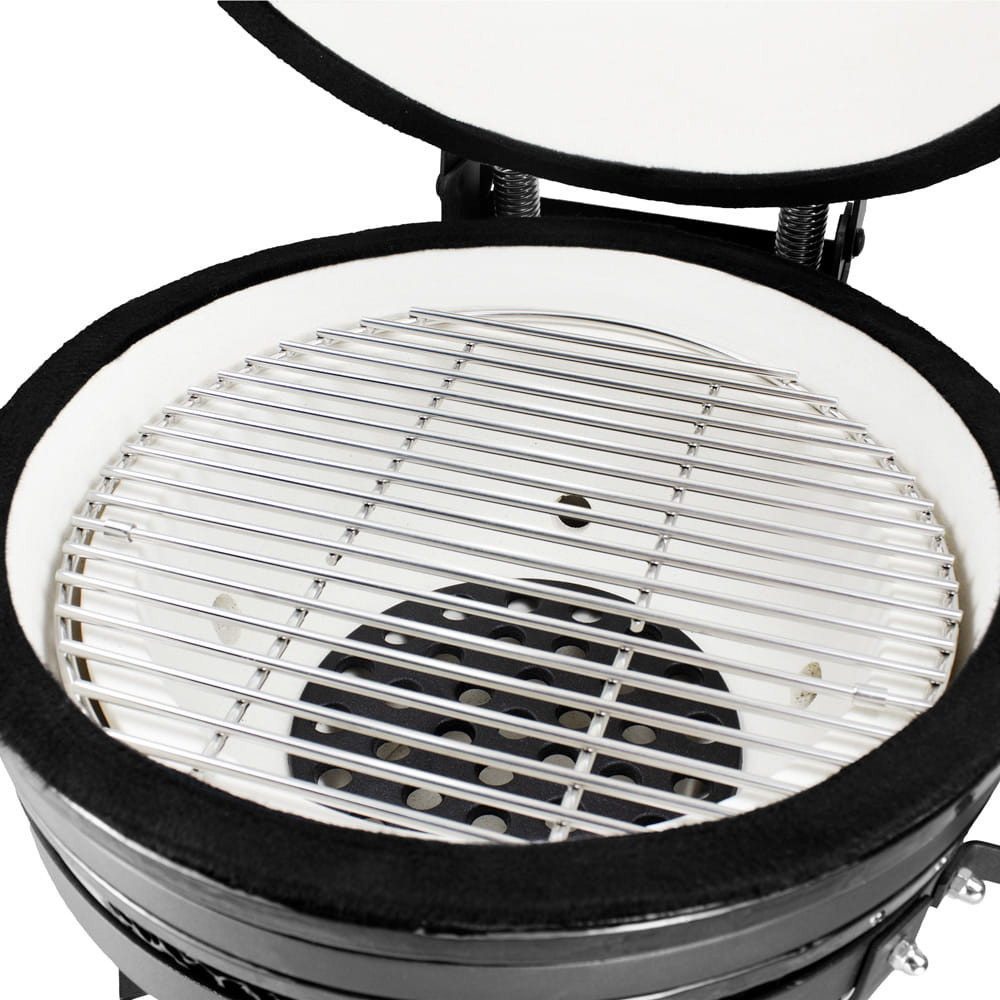 Kerámia faszén grill a kiváló grillételek szerelmesei számára. A szerkezet szilárdsága a grill fő jellemzője. A grill burkolata és fedele 1000°C-ig ellenálló mullitból készült , ami a készülék tartósabbá tételét és esztétikus megjelenését eredményezi. A rács rozsdamentes acélból készült, így optimálisan sült és lédús ételeket készíthet. Az acél talp kellően stabil, és lehetővé teszi a grill sokféle felületen történő elhelyezését. Ezenkívül a bambusz fogantyúk nemcsak kényelmes viseletet biztosítanak a grillsütő hordozásakor, hanem természetes varázst is kölcsönöznek neki. A fedél beépített hőmérővel rendelkezik, amely megkönnyíti az optimális hőmérséklet fenntartását az ételek sütésekor. A felső és az alsó szellőzés állandó légáramlást biztosít, lehetővé téve az ételkészítési folyamat pontos irányítását.